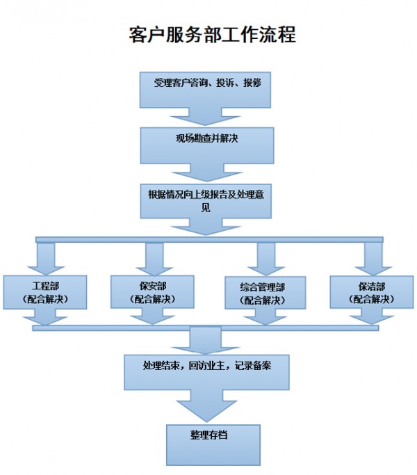 客服部:各類商戶入駐手續辦理;物業服務、咨詢、報修、投訴;